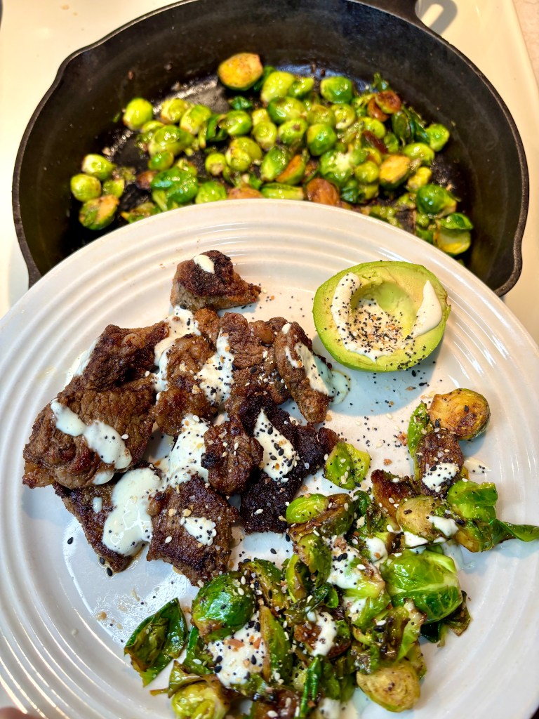 To complete the meal, pair your Brussels sprouts with a juicy steak and half an avocado (drizzled with homemade avocado oil garlicky dressing). This nutrient-packed plate delivers protein, healthy fats, and fiber—a trio that keeps you full and satisfied while supporting your health goals. Bon appétit!